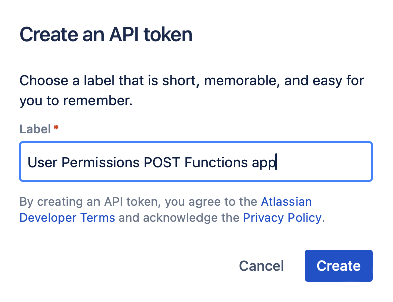 - Specify a label for the API token, e.g. User Permissions POST Functions App and click Create