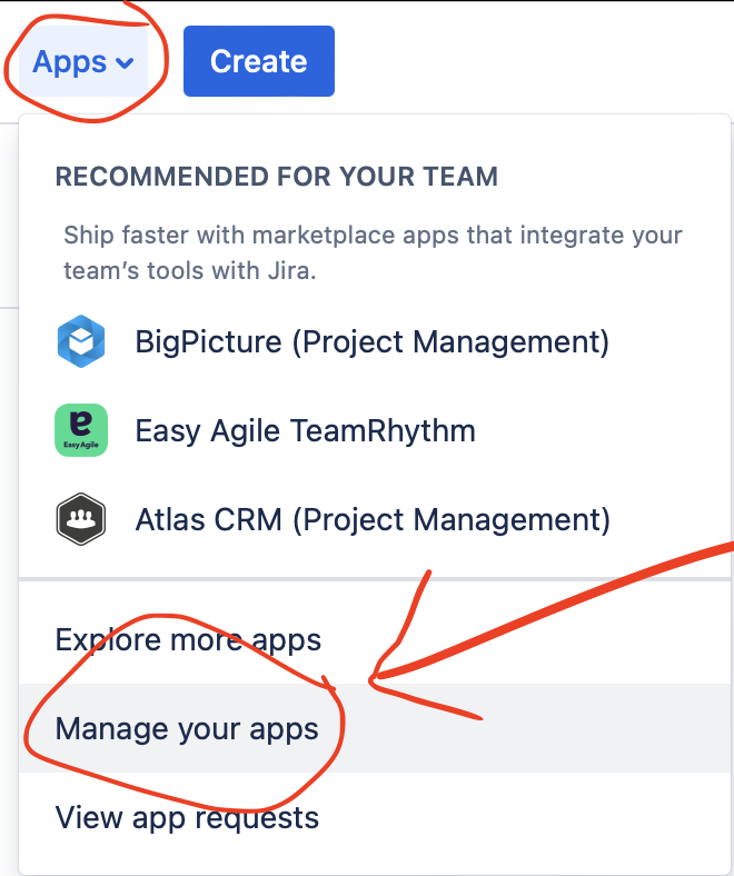 - Open a new tab and browse to your Jira site URL. Click the on the Apps tab along the top and select Manage your apps
