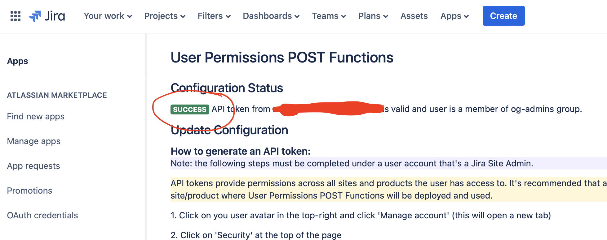 - API tokens can be revoked by the user or the token will become invalid if the user is disabled or deleted, therefore it may be necessary to repeat these steps again in the future. You can test the validity of the token by clicking Apps – Manage your apps – User Permissions POST Functions in Jira and referring to step 11 of this guide.